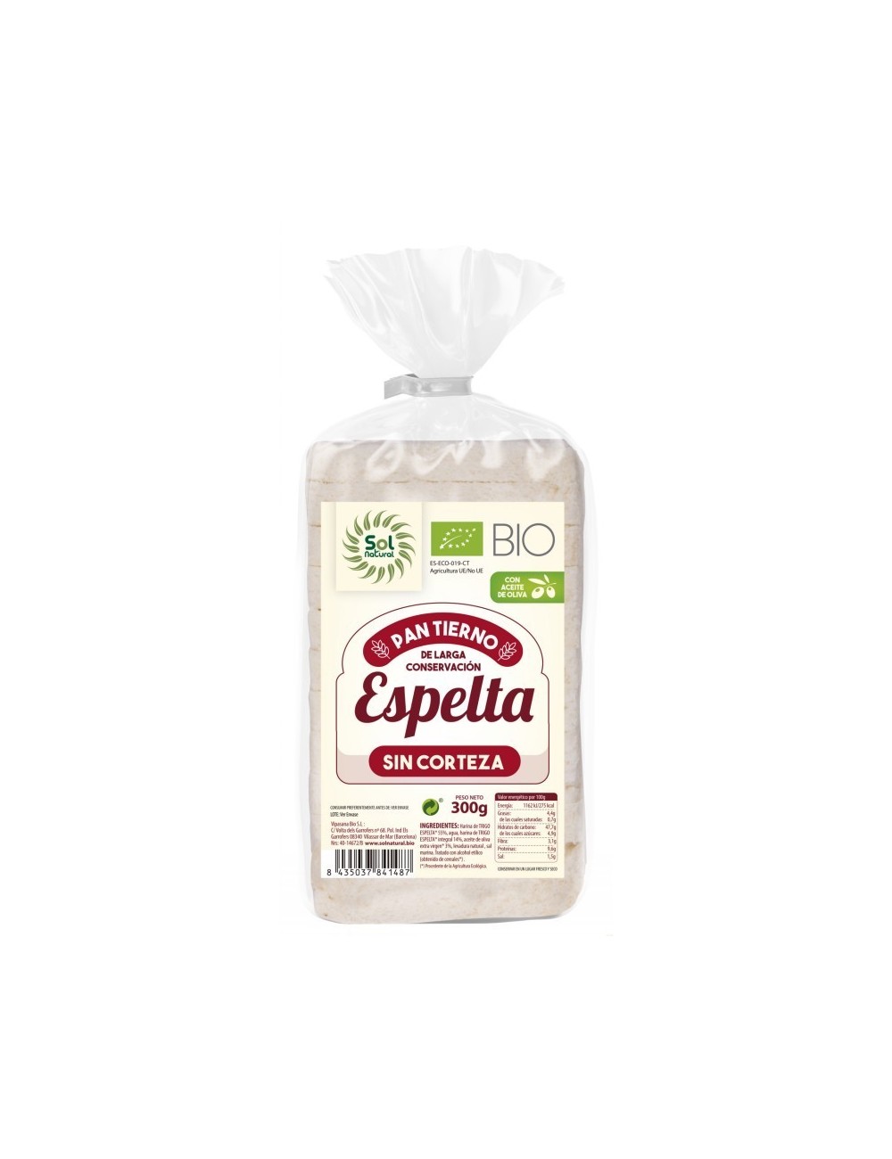 Pan tierno espelta molde sin corteza SOL NATURAL 300 gr BIO