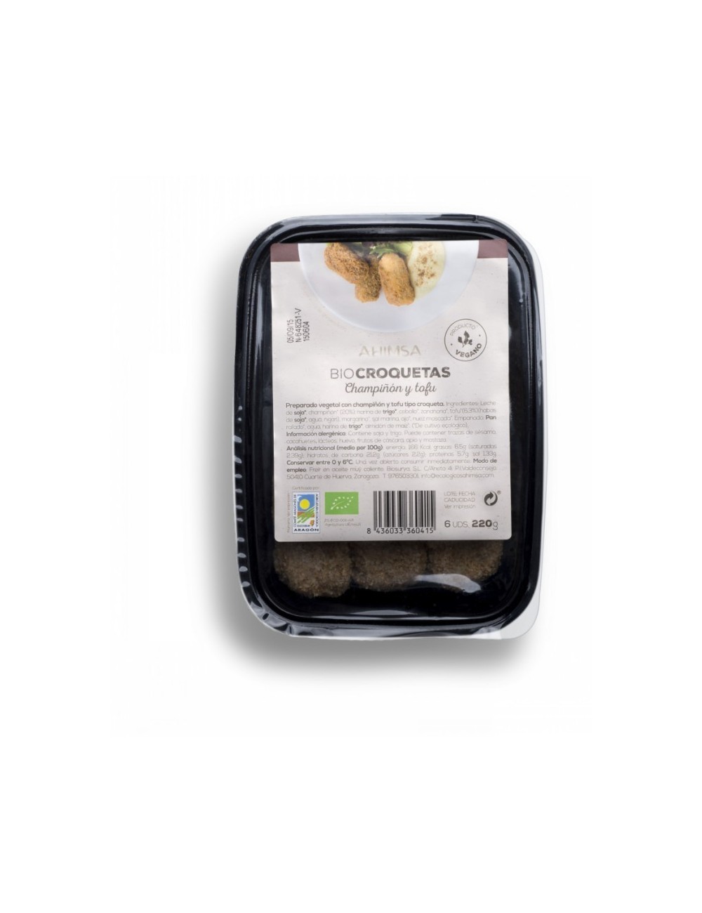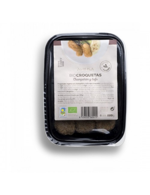 Ingredientes: Leche de soja*, champiñón* (20,6%), harina de trigo*, cebolla*, zanahoria*, tofu*(6,0%)(agua, habas de soja*, coagulante [sulfato de calcio]), margarina*, sal marina, ajo*, nuez moscada*. Empanado: pan rallado*, leche de soja*.